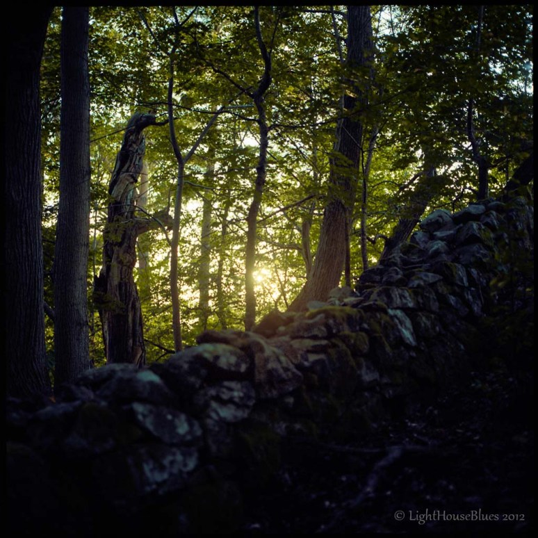 An old stone wall in evening sunlight