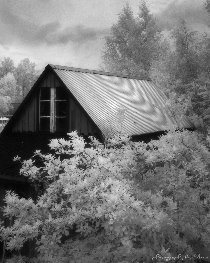 Garden shed in IR on an overcast day