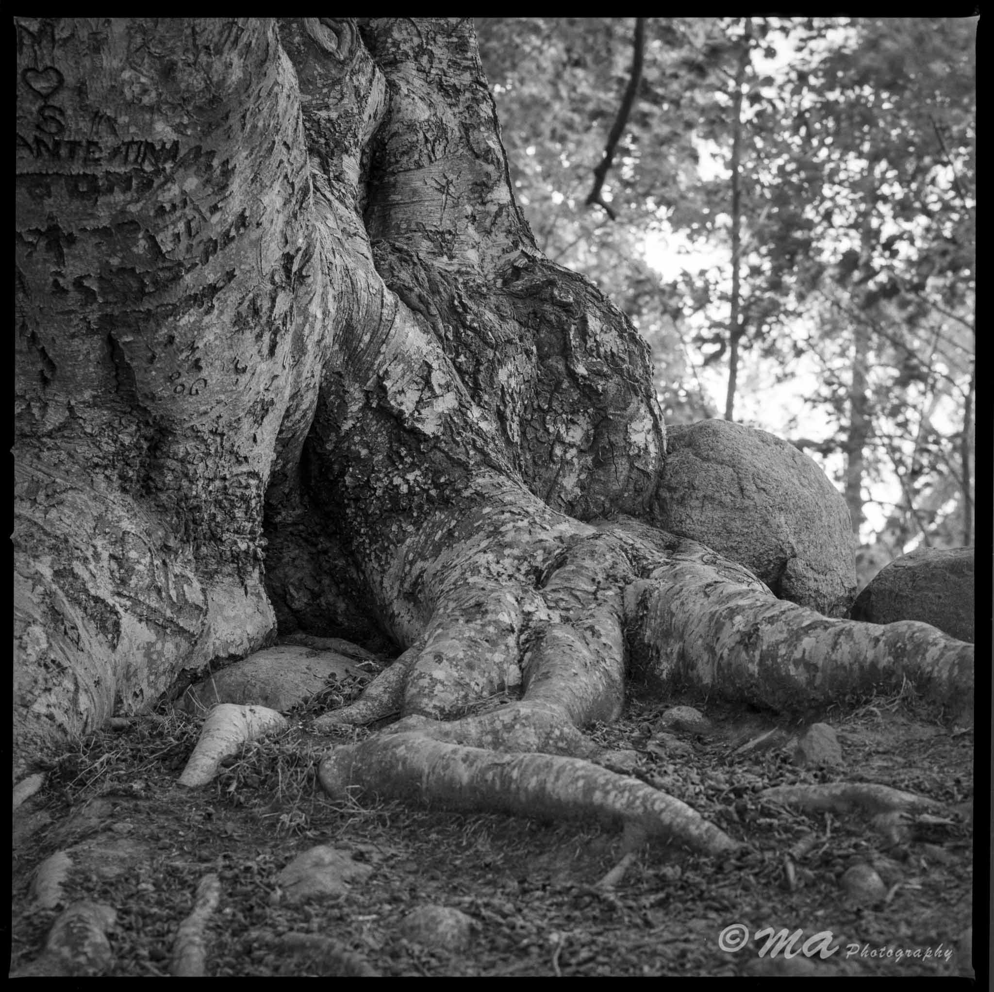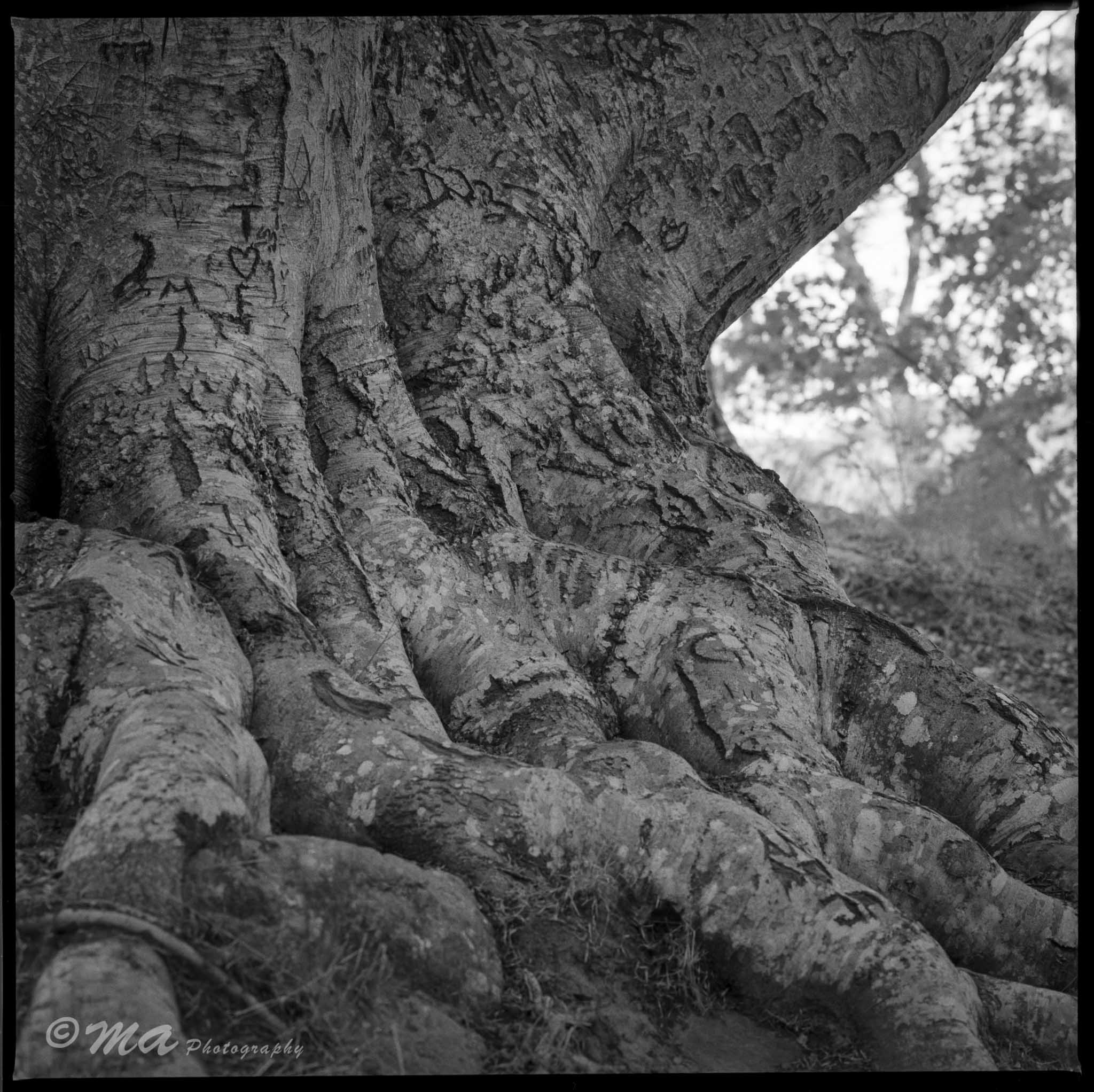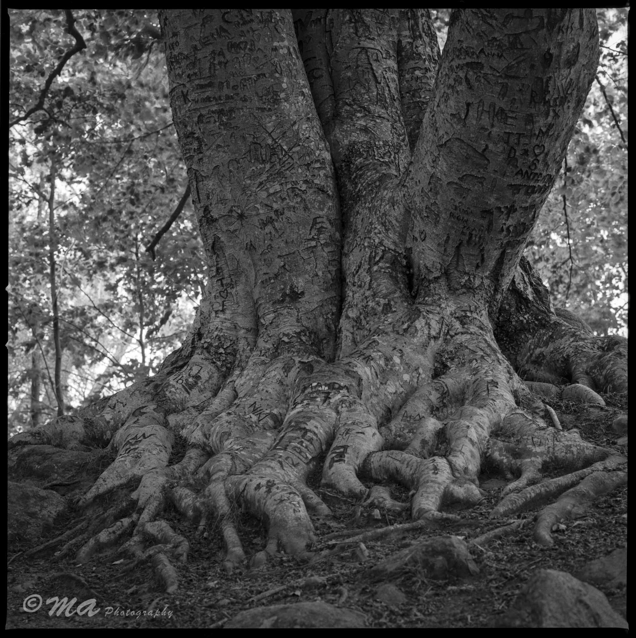 A beech tree with initials, hearts and names engraved in the ancient tree trunk.